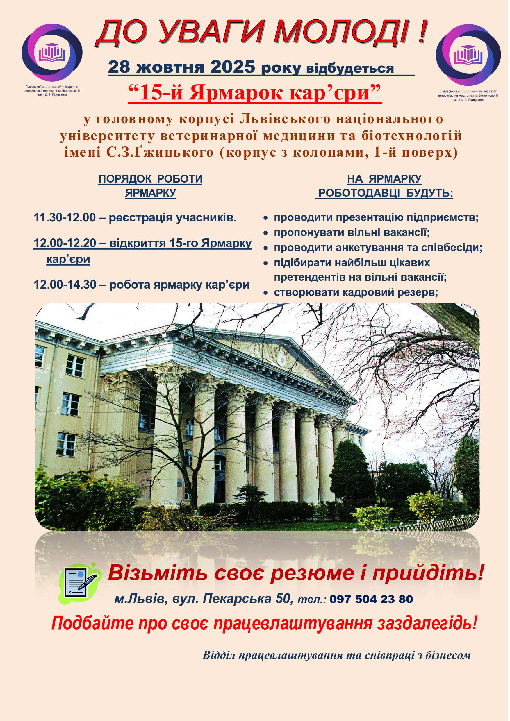 28 жовтня у Львівському національному університеті ветеринарної медицини та біотехнологій імені С.З. Ґжицького відбудеться «15-й Ярмарок кар’єри».