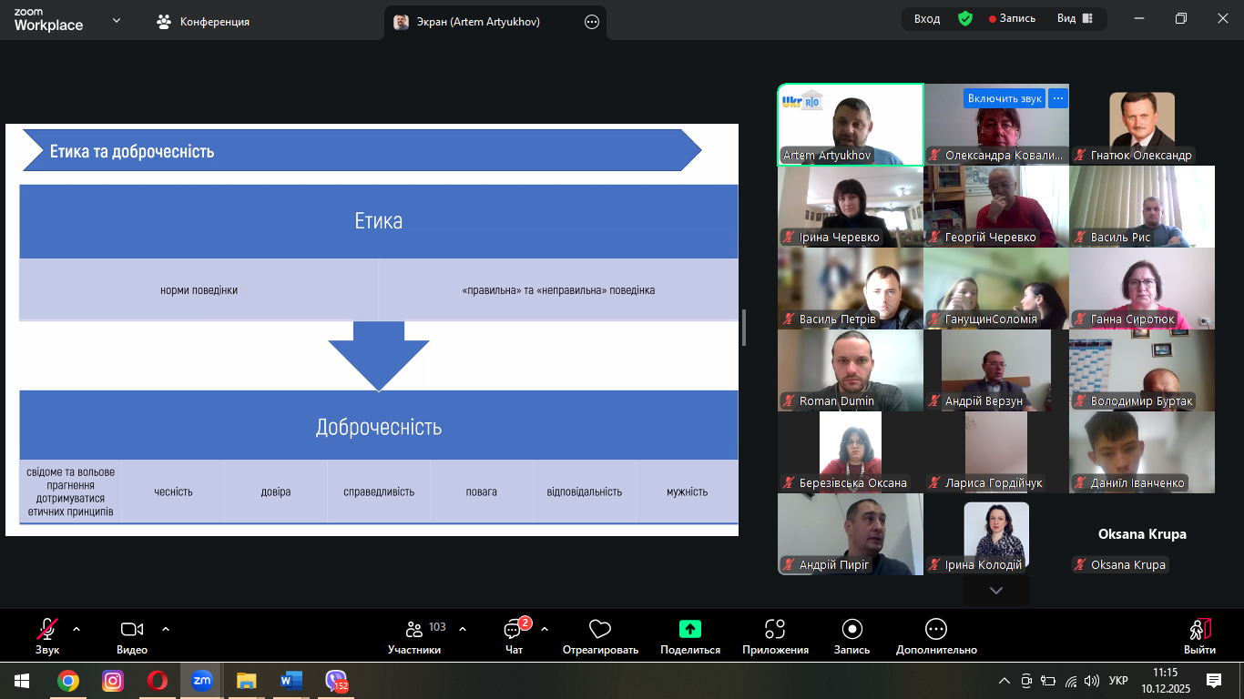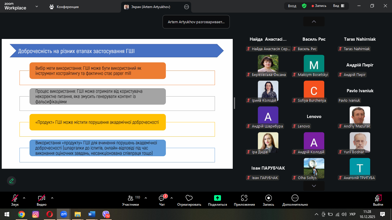Спікером заходу був Артем Артюхов – керівник Українського офісу дослідницької доброчесності, голова Комітету з питань етики Національного агентства із забезпечення якості вищої освіти. У своїй доповіді він зосередив увагу на ключових аспектах розвитку академічної доброчесності, відповідального використання сучасних цифрових технологій та формування етичної культури в освітньому й науковому середовищі.
