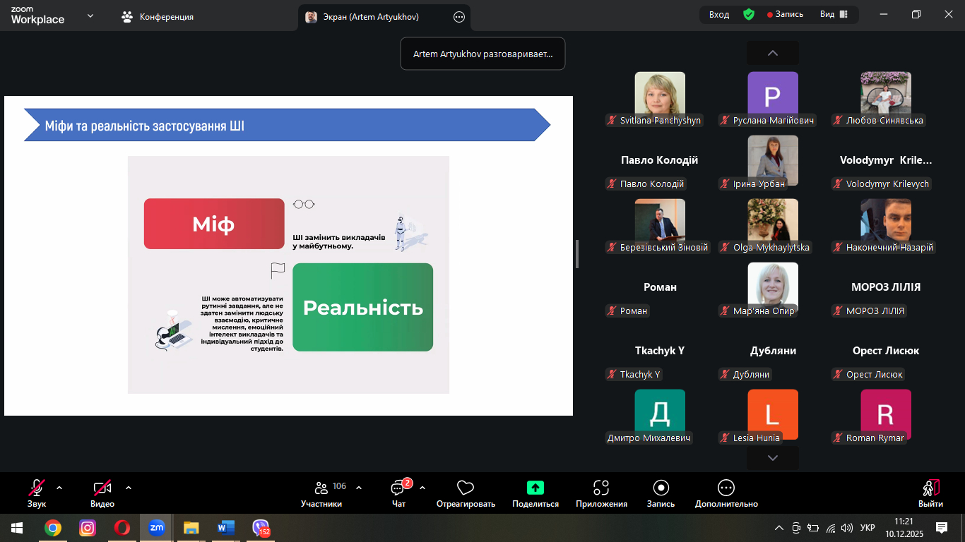 Викладачі та здобувачі вищої освіти третього (освітньо-наукового) рівня «Доктор філософії» факультету землевпорядкування та інфраструктурного розвитку долучилися до гостьової онлайн-лекції «(Без)відповідальний ГШІ», що відбулася 10 грудня 2025 року за підтримки ректора університету Івана Парубчака та з ініціативи Центру підтримки технологій та інновацій ЛНУВМБ імені С.З. Ґжицького.
