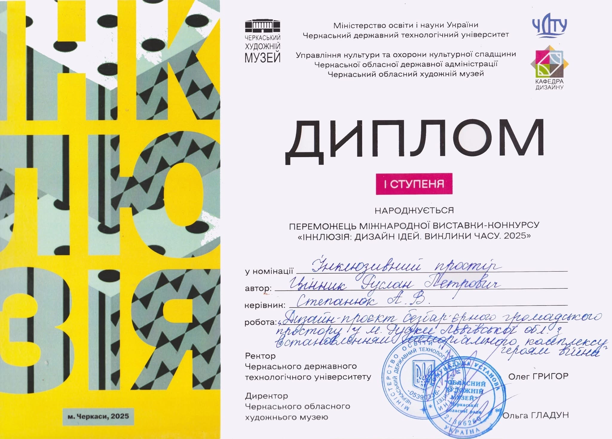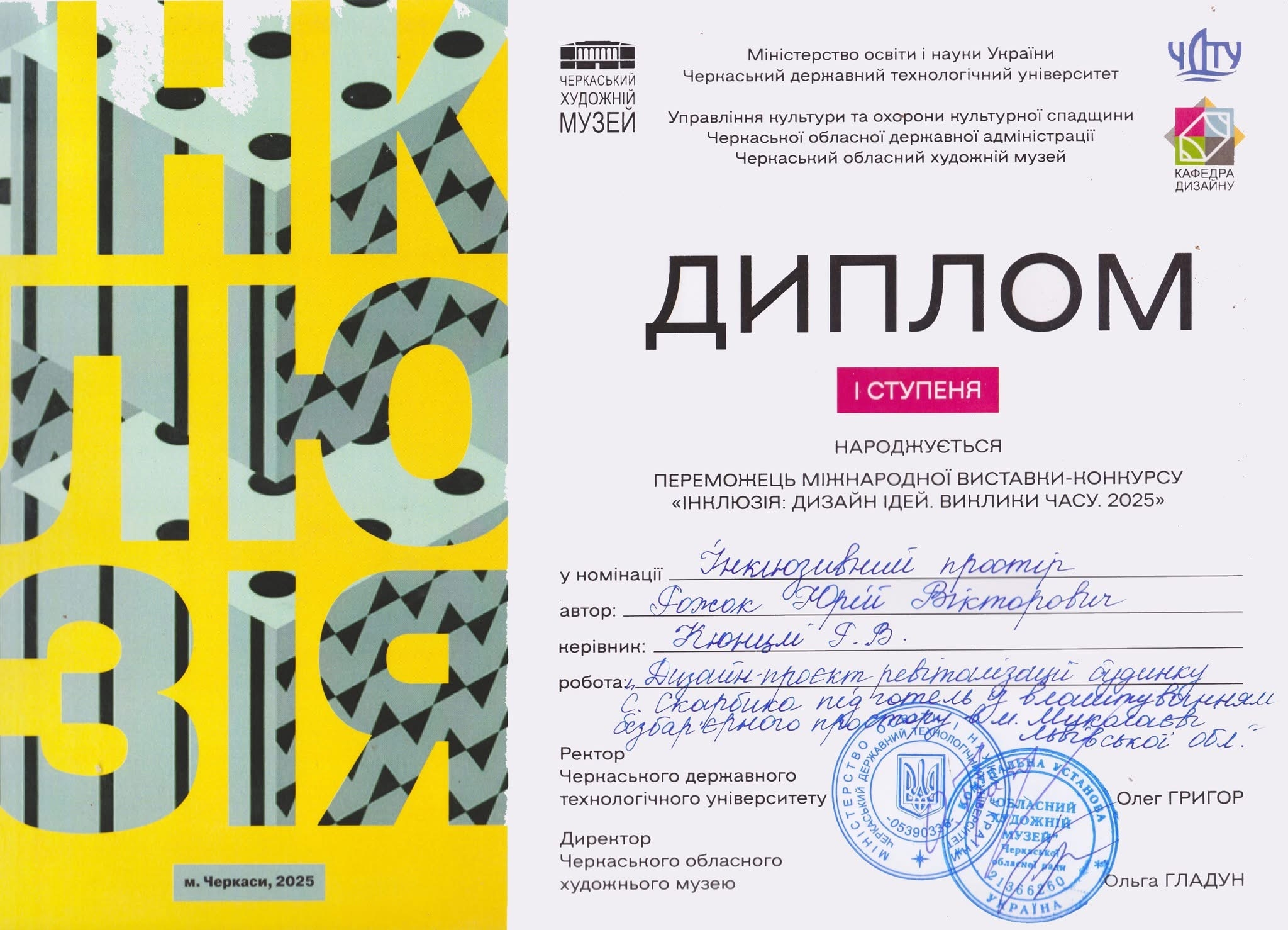Кафедра архітектури щиро вітає талановитих студентів спеціальності «Архітектура та містобудування» Юрія Рожка (Арх-41) та Руслана Ціника (Арх-61) із перемогою на міжнародній виставці-конкурсі «Інклюзія: дизайн ідей. Виклики часу. 2025», що відбулася у Черкаському художньому музеї.