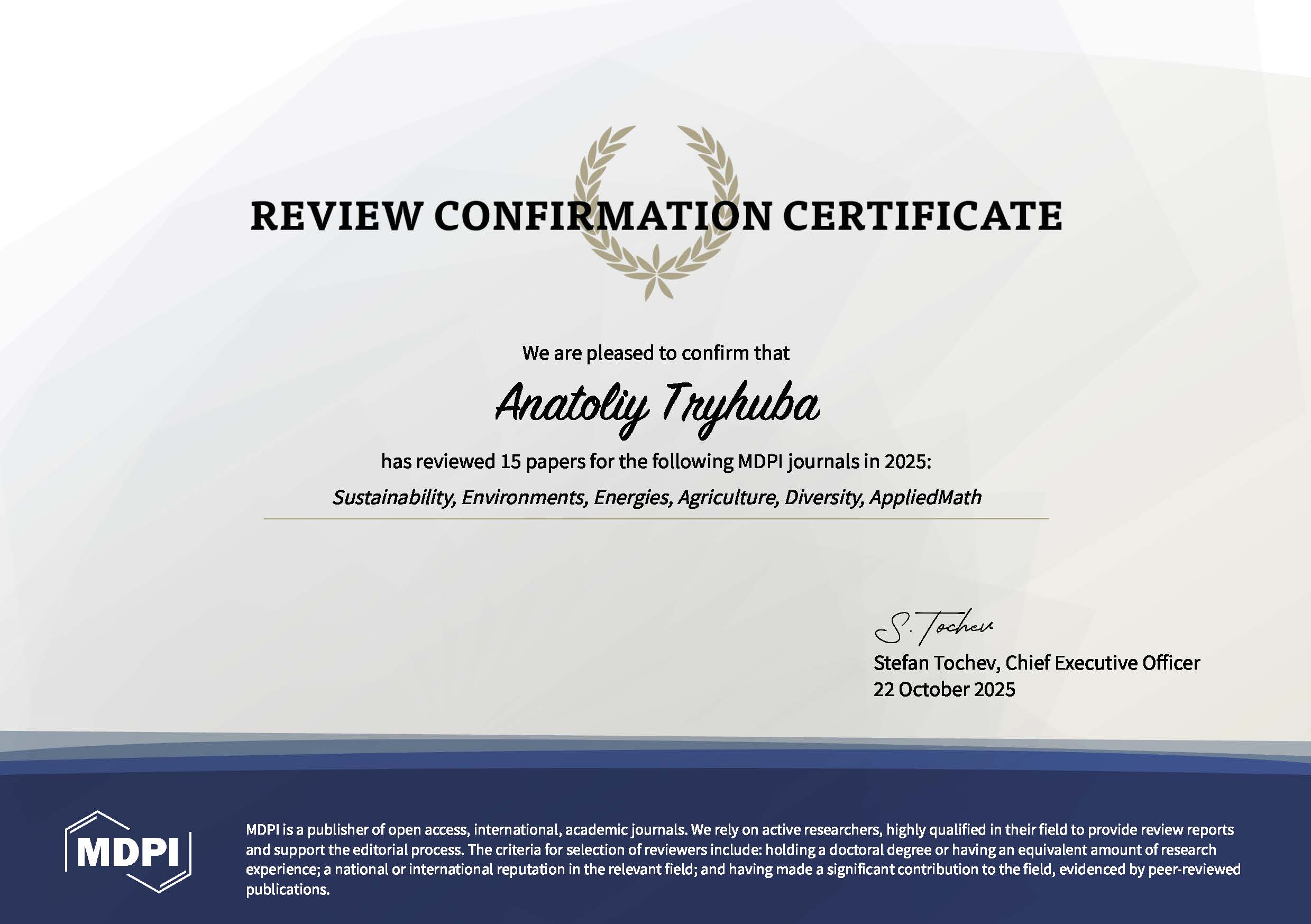 Професор Анатолій Тригуба також активно співпрацює з міжнародними науковими спільнотами, є рецензентом видань MDPI (Sustainability, Energies, Environments, Agriculture, Diversity, AppliedMath), де у 2025 році здійснив 15 рецензій наукових статей, підтверджених офіційним сертифікатом.