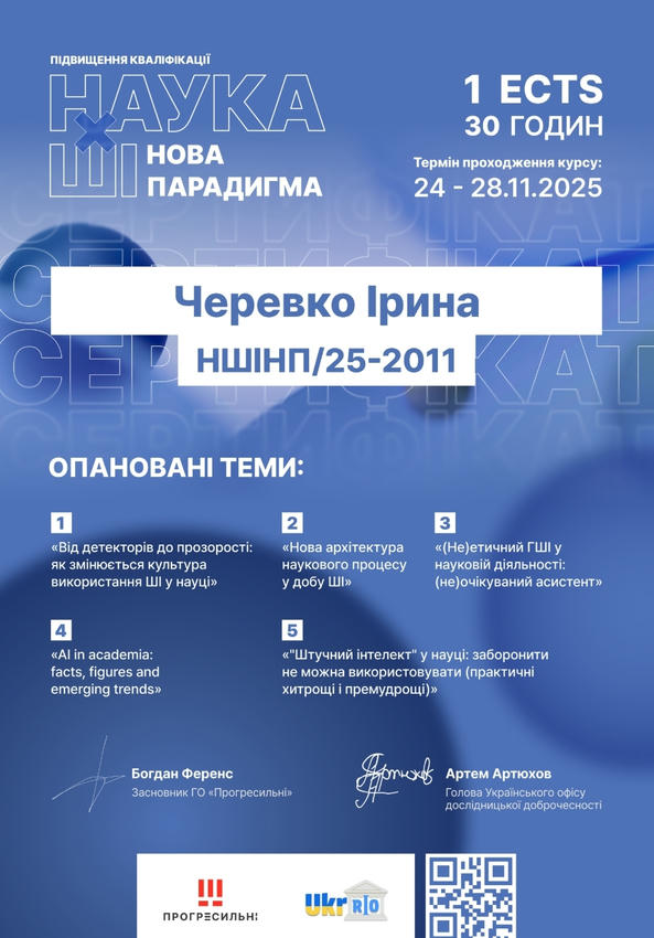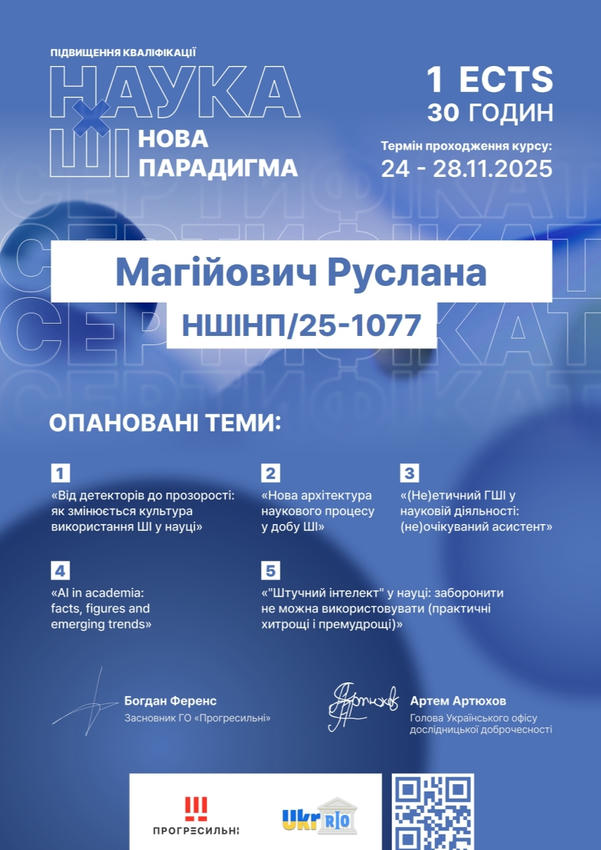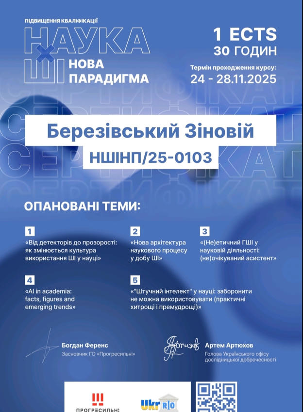 Викладачі кафедри економіки ЛНУВМБ імені С.З. Ґжицького успішно пройшли онлайн-курс підвищення кваліфікації «Наука ШІ: нова парадигма», що відбувся 24-28 листопада 2025 року та був організований ГО «Прогресильні» у співпраці з Українським офісом дослідницької доброчесності.