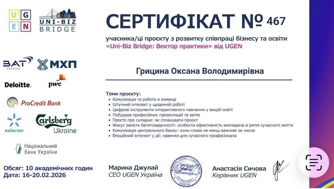 16-20 лютого 2026 року викладачі кафедри фінансів, банківської справи та страхування ЛНУВМБ імені С.З. Ґжицького – О.В. Грицина, А.В. Колодій, Г.В. Східницька, О.В. Шолудько – брали участь у проєкті «Uni-biz Bridge: вектор практики», спрямованому на посилення взаємодії освіти й бізнесу, удосконалення професійних компетентностей викладачів і впровадження сучасних підходів у навчальний процес.