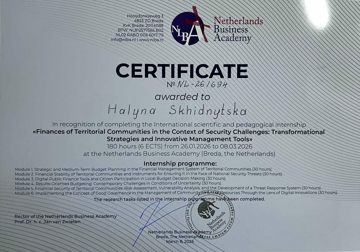 Розвиток фахової та викладацької майстерності найкраще забезпечується через підвищення кваліфікації та проходження стажування як на національному, так і на міжнародному рівнях. З огляду на це доценти кафедри фінансів, банківської справи та страхування Галина Східницька та Андрій Колодій успішно завершили міжнародне науково-педагогічне стажування «Фінанси територіальних громад в умовах безпекових викликів: трансформаційні стратегії та інноваційні інструменти управління», яке проходило з 26 січня до 8 березня 2026 року та було організоване Netherlands Business Academy (Breda, the Netherlands) спільно з Ukrainian-American Association of College Educators (Ukraine, USA).