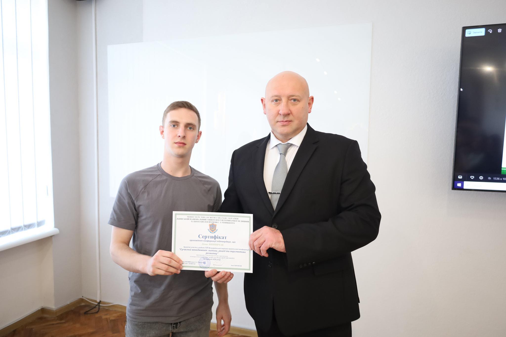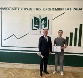 За активну участь у XII Всеукраїнській студентській науково-практичній конференції студент групи Фін-21 Денис Винничак був відзначений сертифікатом учасника, який отримав із рук ректора Львівського національного університету ветеринарної медицини та біотехнологій імені С.З. Ґжицького, доктора наук з державного управління, професора Івана Парубчака.