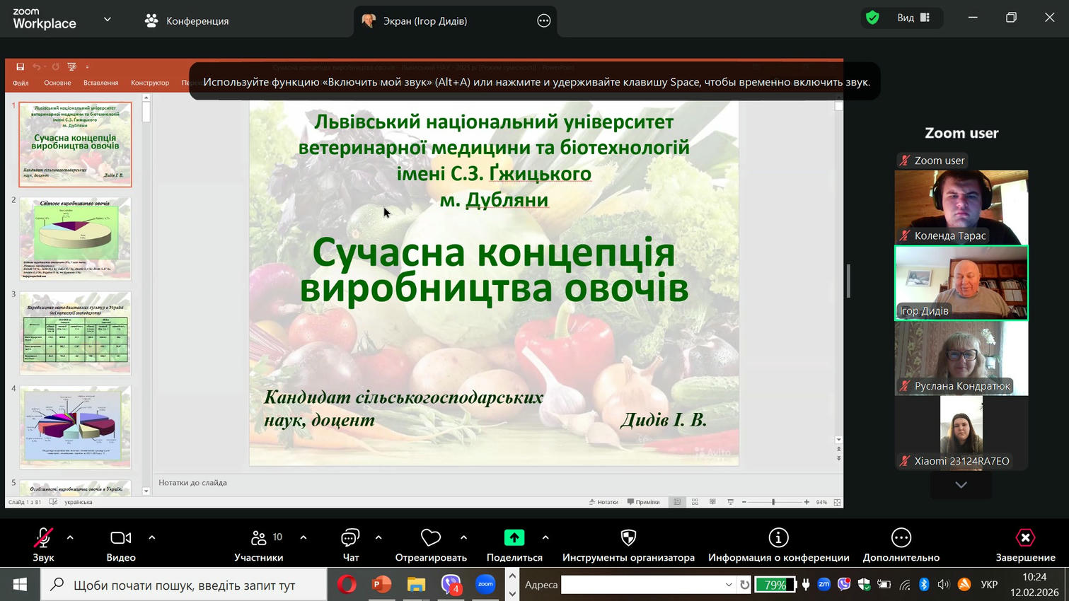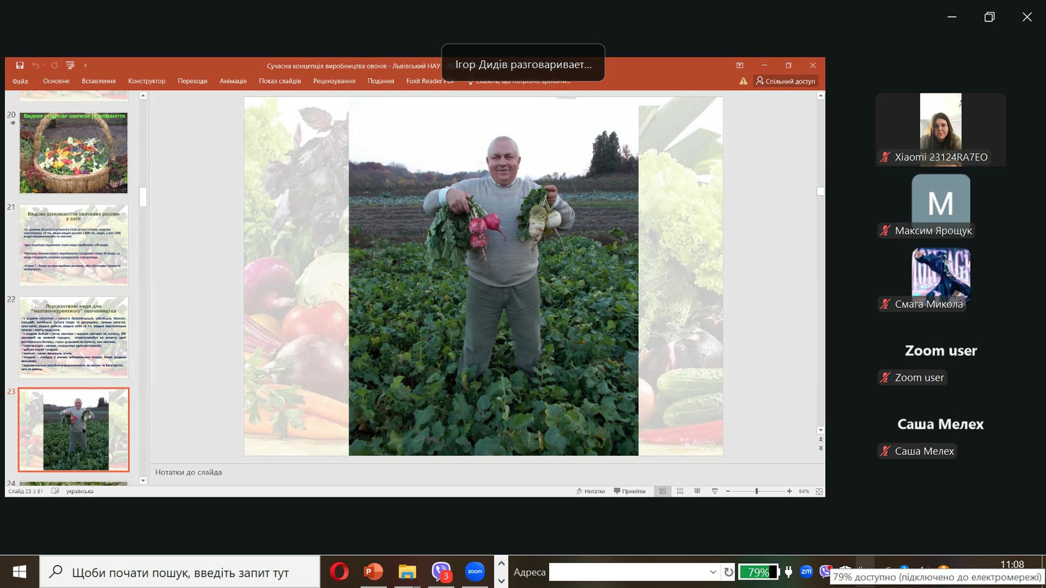 Кандидат сільськогосподарських наук, доцент кафедри садівництва та овочівництва імені Івана Гулька Львівського національного університету ветеринарної медицини та біотехнологій імені С.З. Ґжицького Ігор Володимирович Дидів розповів про стан та перспективи розвитку овочівництва в умовах глобальних змін клімату і воєнного стану в Західному регіоні України. Він звернув увагу на особливості вирощування овочевих культур у відкритому та закритому ґрунті, їх використання та вплив на здоров’я людини.