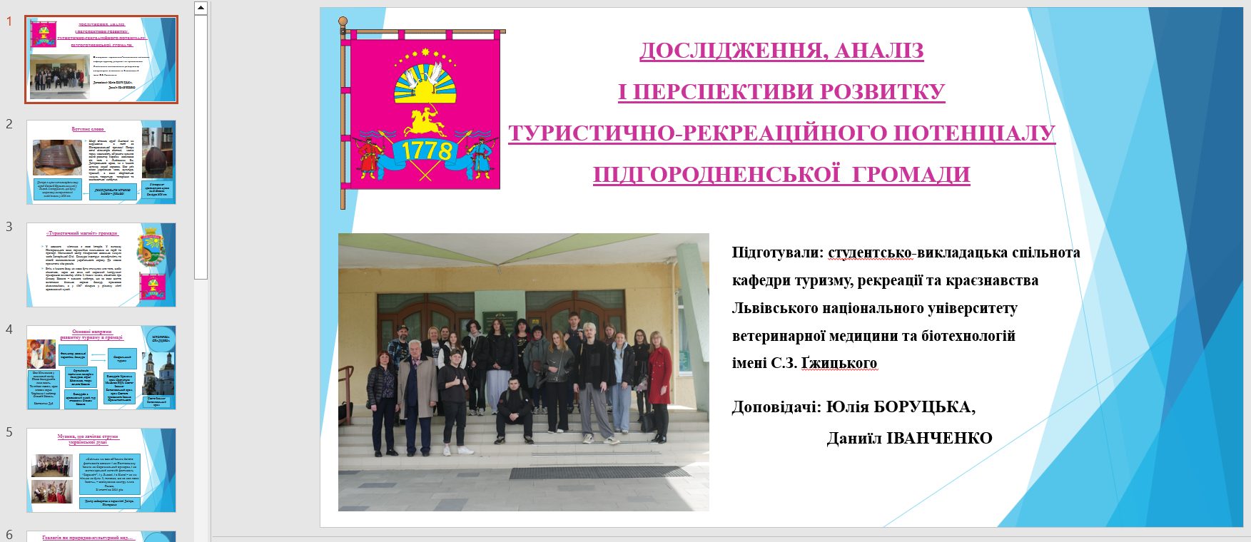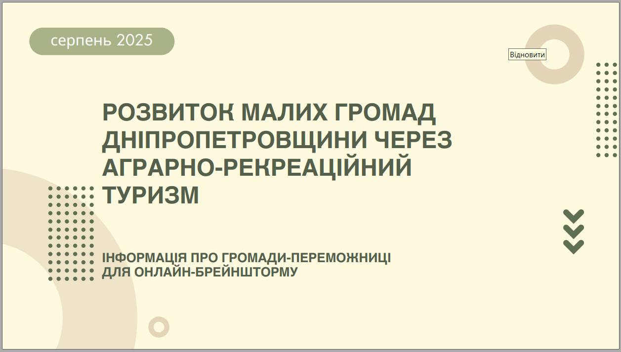 Упродовж серпня 2025 року представники кафедри туризму, рекреації та краєзнавства ЛНУВМБ імені С.З. Гжицького ‒ доцентка Юлія Боруцька та здобувач вищої освіти спеціальності 242 Туризм і рекреація Даниїл Іванченко ‒ взяли участь у серії онлайн-брейнштормів щодо розвитку туристично-рекреаційного потенціалу Дніпропетровщини в рамках проєкту «Розвиток малих громад Дніпропетровщини через аграрно-рекреаційний туризм», який реалізовується за підтримки Міжнародного фонду «Відродження» та агенції «Хліб для світу» в межах ініціативи «Лабораторія стійкості».