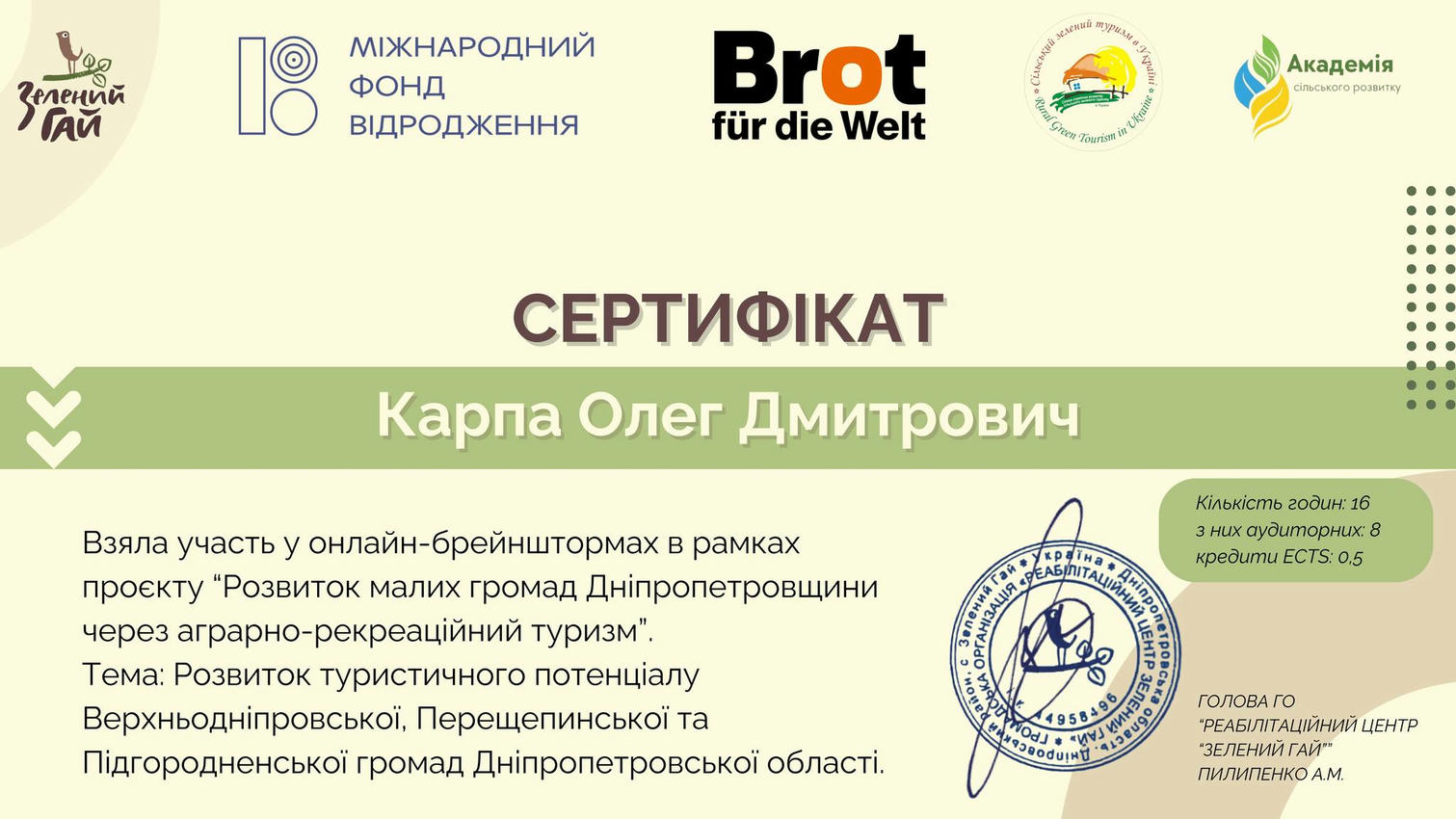 Здобувачі вищої освіти спеціальності 242 Туризм і рекреація, котрі брали участь у серії онлайн-брейнштормів, у рамках проєкту «Розвиток малих громад Дніпропетровщини через аграрно-рекреаційний туризм» під керівництвом доцентки Юлії Борульцької та, попри канікулярний період, активно долучилися до професійного обговорення і надали рекомендації щодо висвітлення туристично-рекреаційного потенціалу Дніпропетровщини (Даниїл Іванченко, Дарія Кобринчук, Тетяна Янкова, Олег Карпа, Ярина Малетич), а також уся студентсько-викладацька спільнота кафедри туризму, рекреації та краєзнавства ЛНУВМБ імені С.З. Гжицького на чолі зі завідувачкою - Оксаною Крупою, щиро вдячні організаторам заходу − ГО «Реабілітаційний центр «Зелений Гай», Спілці сільського зеленого туризму України, Академії сільського розвитку за активне залучення, безцінний досвід, інформаційні матеріали та смачні подарунки..!