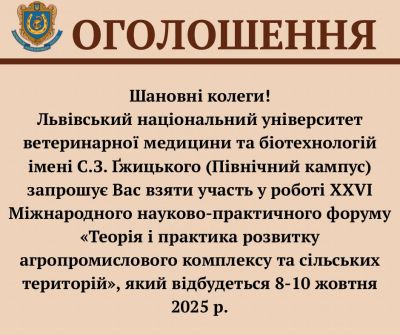 8 жовтня 2025 року у Львівському національному університеті ветеринарної медицини та біотехнологій імені С.З. Ґжицького (Північний кампус) розпочав роботу XXVI Міжнародний науково-практичний форум «Теорія і практика розвитку агропромислового комплексу та сільських територій», традиційний науковий захід, який кожної осені у Дублянах збирає науковців з України та з-за кордону.