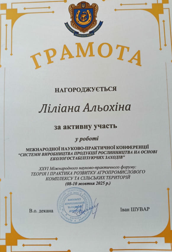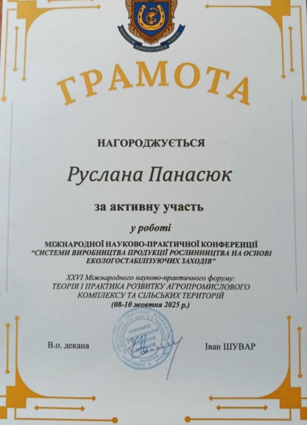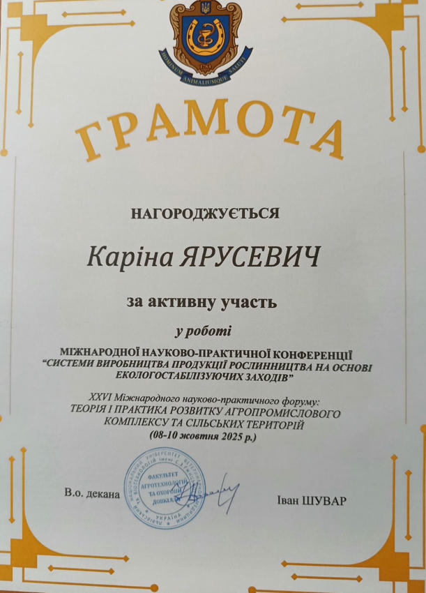 Високо цінуємо перспективну й далекоглядну ініціативу декана факультету агротехнологій та охорони довкілля, доктора сільськогосподарських наук, професора, заслуженого діяча науки і техніки України, доктора Honoris Causa Природничого університету в Любліні Івана Антоновича Шувара, за сприяння якого учасниці гуртка «Агрономія» КЗ ЛОР «Львівська обласна Мала академія наук учнівської молоді», учениці 9-А класу Дублянського опорного ліцею імені Героя України Анатолія Жаловаги долучилися до наукового форуму, який відбувся 8 жовтня 2025 року у Львівському національному університеті ветеринарної медицини та біотехнологій імені С.З. Ґжицького (Північний кампус, м. Дубляни).