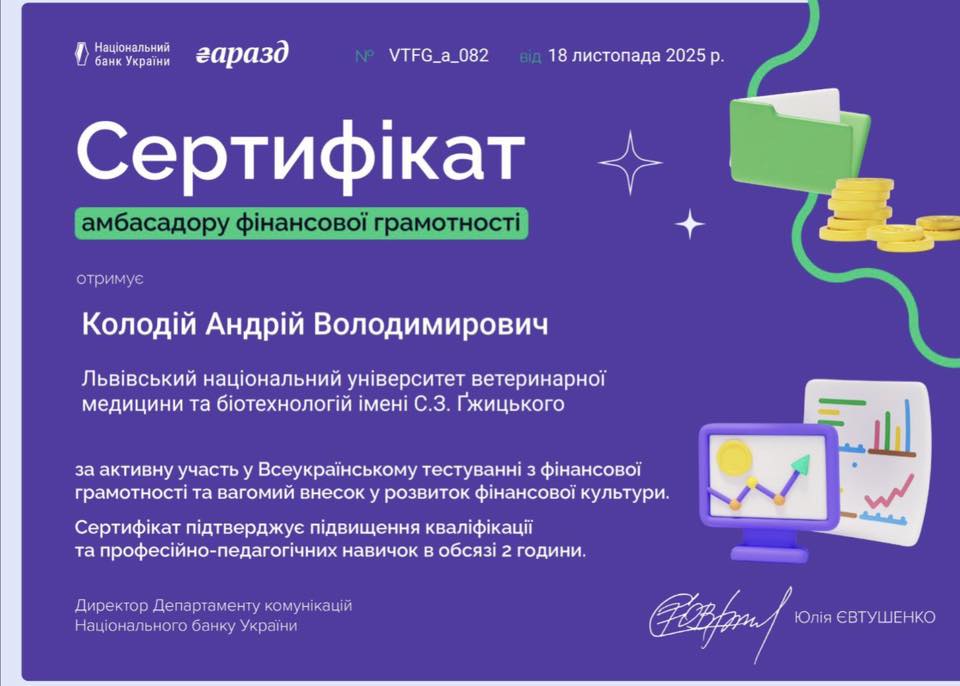 Викладачі кафедри фінансів, банківської справи та страхування Львівського національного університету ветеринарної медицини та біотехнологій ім. С.З. Ґжицького доценти О.Г. Агрес, Г.В. Східницька, А.В. Колодій разом зі здобувачами вищої освіти долучилися до Всеукраїнського тестування з фінансової грамотності, організованого Національним банком України з нагоди Всесвітнього дня заощаджень. Участь у цій ініціативі стала для наших студентів не лише перевіркою знань, а й практичним кроком до формування відповідального ставлення до особистих фінансів.