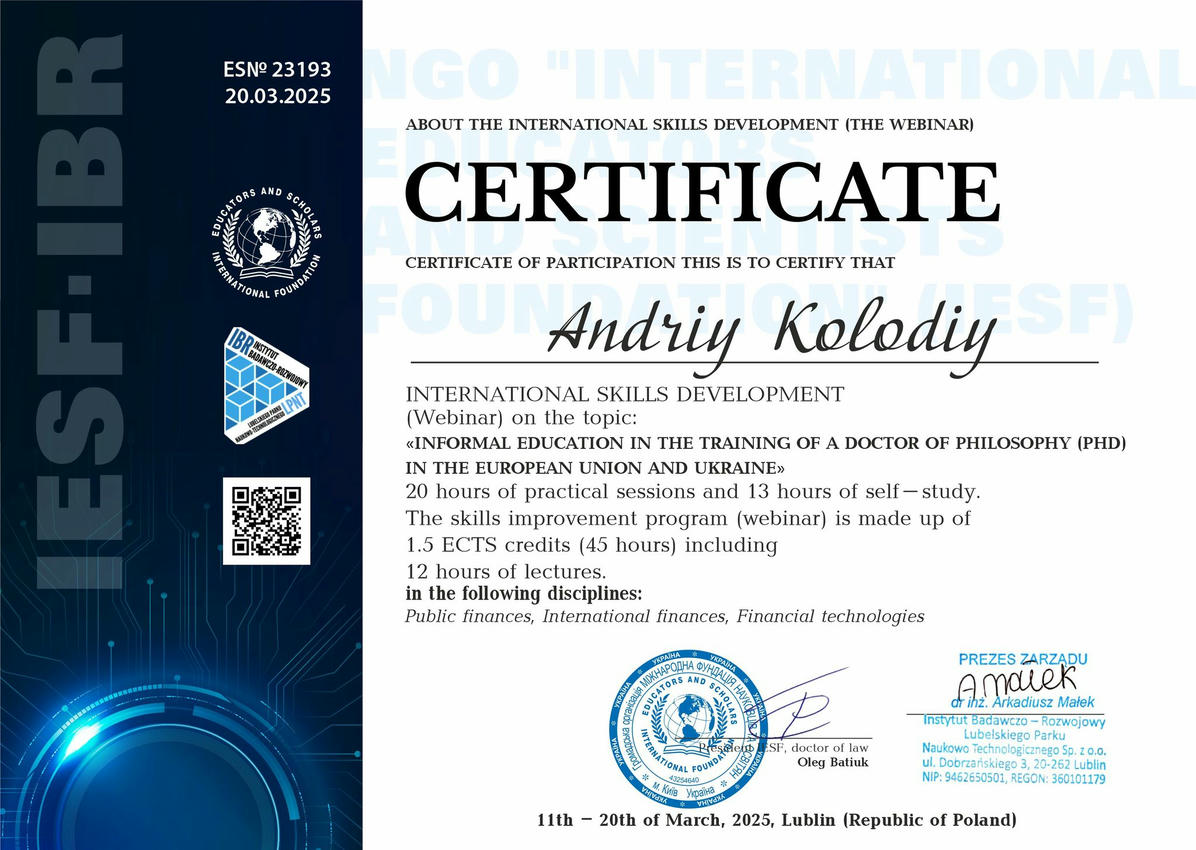 У період з 11 по 20 березня 2025 року доцент кафедри фінансів, банківської справи та страхування Андрій Колодій пройшов міжнародне підвищення кваліфікації на тему «Неформальна освіта у підготовці доктора філософії (PhD) в країнах Європейського Союзу та Україні», організоване Науково-дослідним інститутом Люблінського науково-технологічного парку (Instytut Badawczo-Rozwojowy Lubelskiego Parku Naukowo-Technologicznego) та ГО «Міжнародна фундація науковців та освітян».