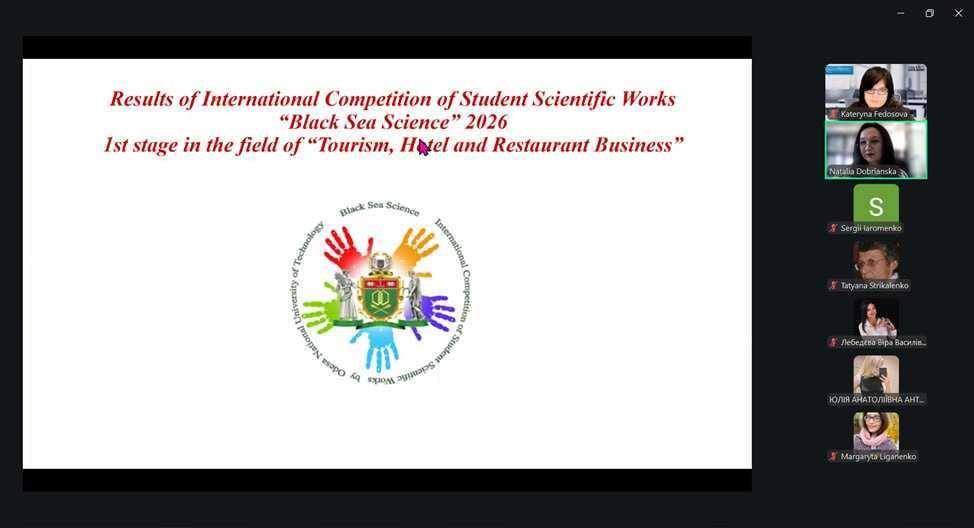 Завершився I етап Міжнародного конкурсу студентських наукових робіт «Black Sea Science – 2026», який щорічно проводиться на базі Одеського національного технологічного університету під егідою Black Sea Universities Network та ISEKI-Food Association і об’єднує молодих науковців із різних країн.
