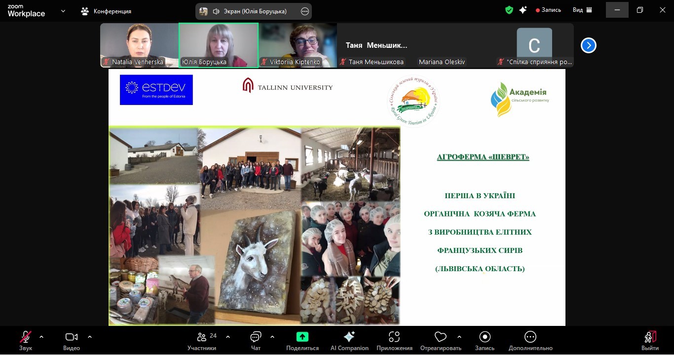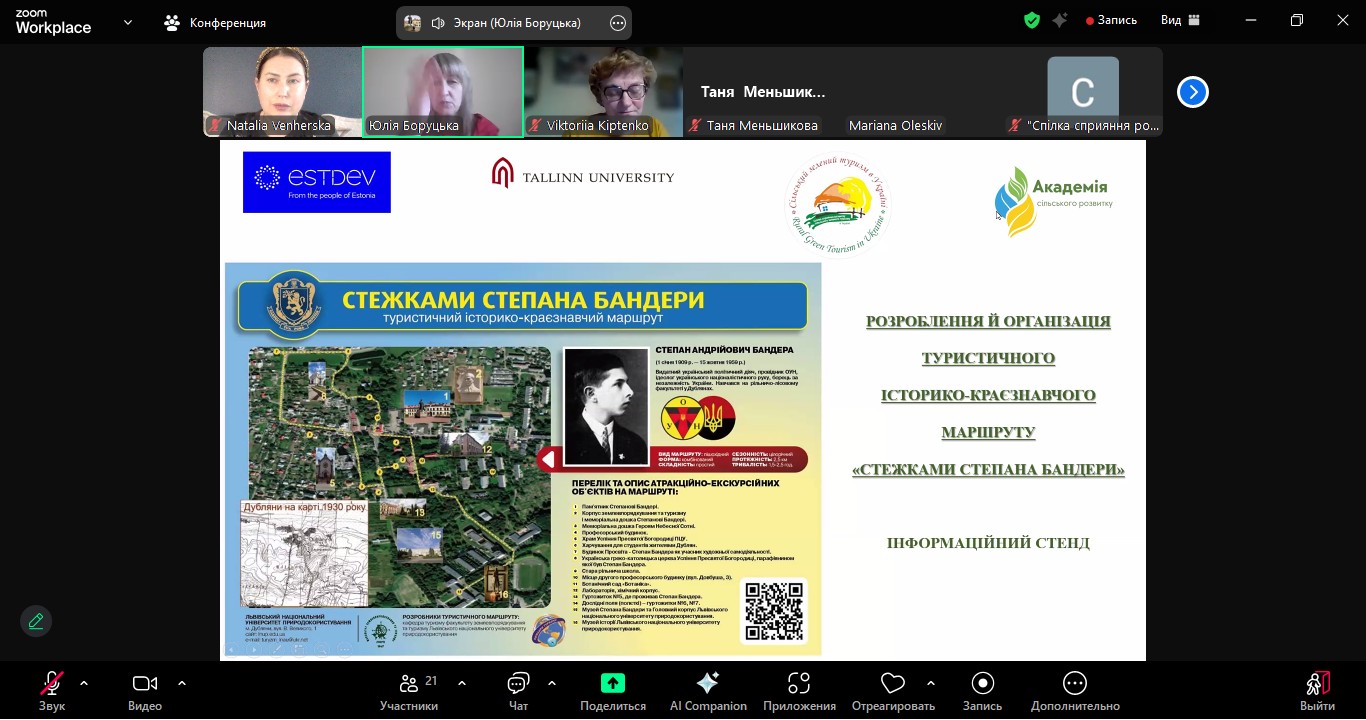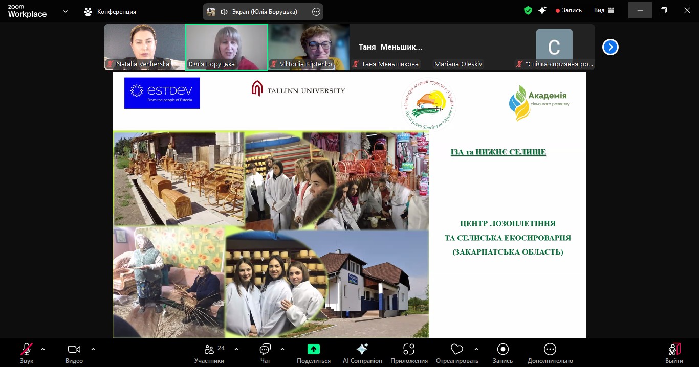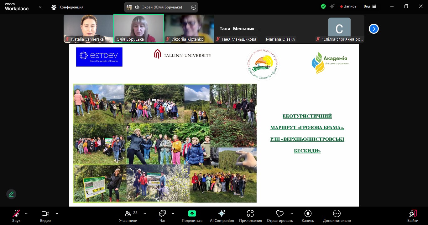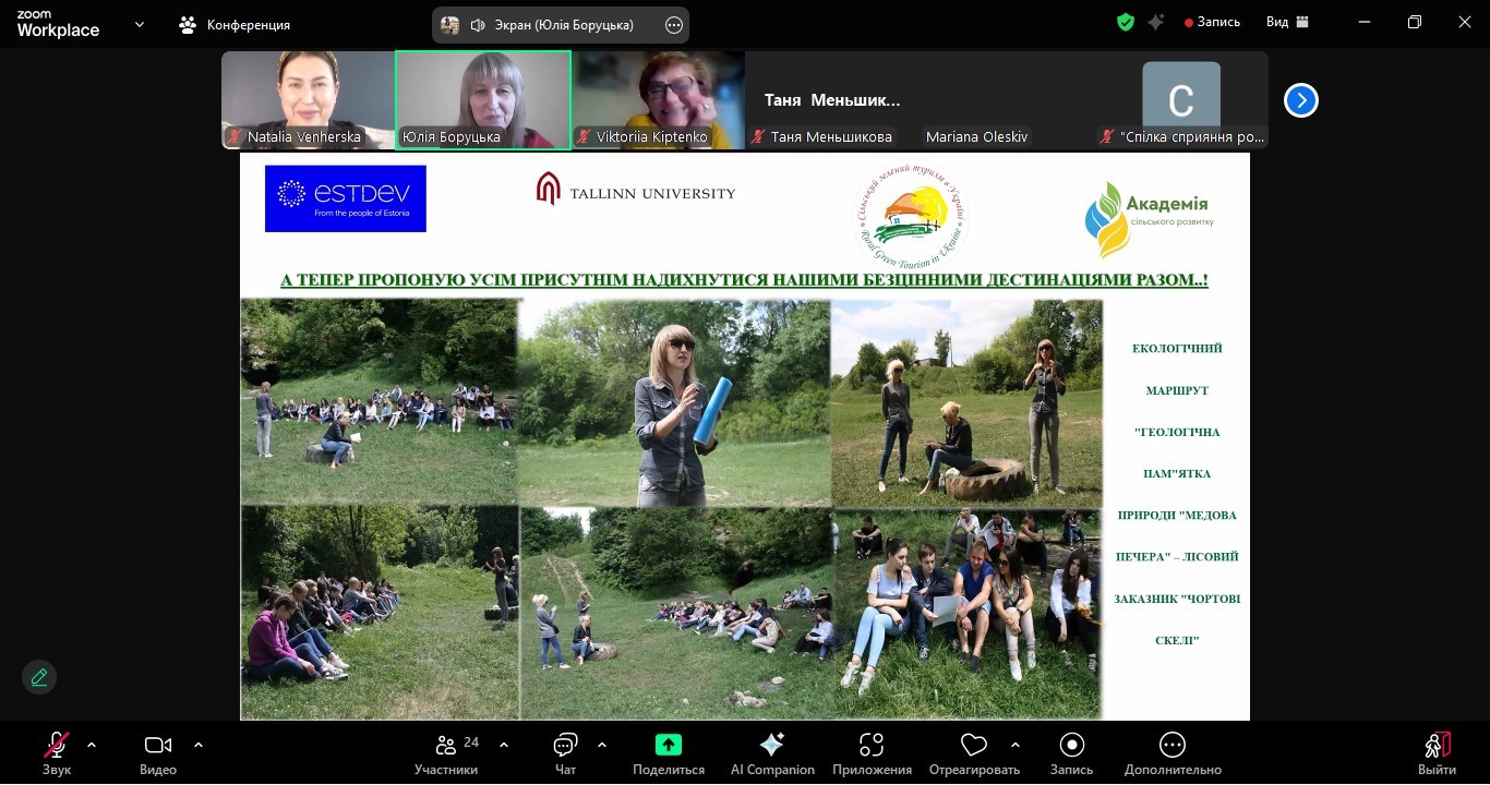 Доповідь доцентки кафедри Юлії Боруцької на тему: "Екопросвітництво через туризм: практичні рішення для сільських громад" в естонсько-українській навчальній програмі «Партнерство для створення спільних локальних продуктів та кластери для підвищення їх експортної спроможності»