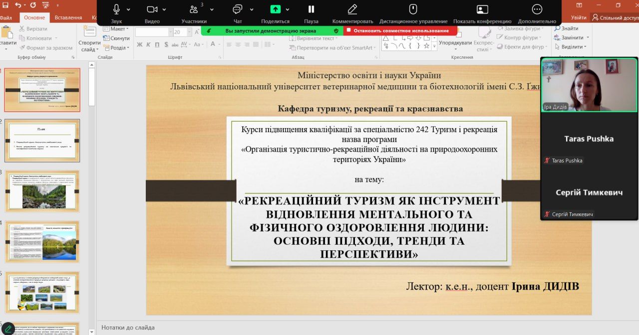 Науково-педагогічними працівниками кафедри туризму, рекреації та краєзнавства Львівського НУВМБ ім.С. Ґжицького вперше було проведено підвищення кваліфікації фахівців за спеціальністю 242 Туризм і рекреація за програмою: «Організація туристично-рекреаційної діяльності на природоохоронних територіях України». Нашими слухачами стали працівники національного природного парку «Північне Поділля», яких зацікавила дана тематика.