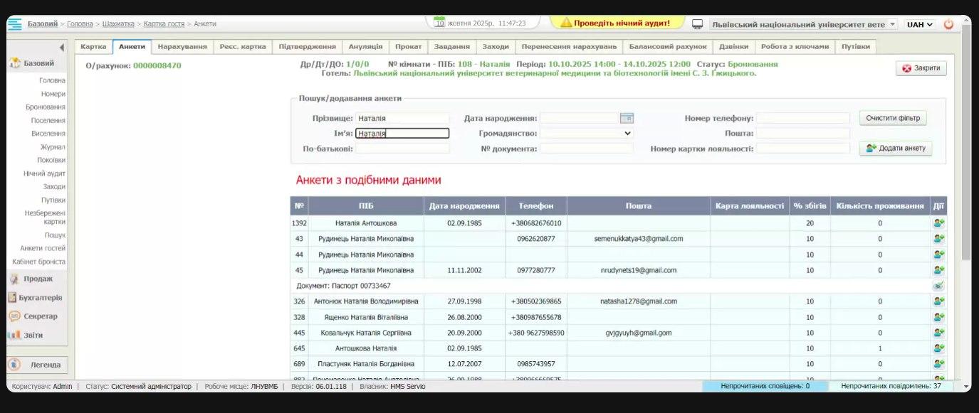 • організацію процесів бронювання, поселення та виїзду гостей;