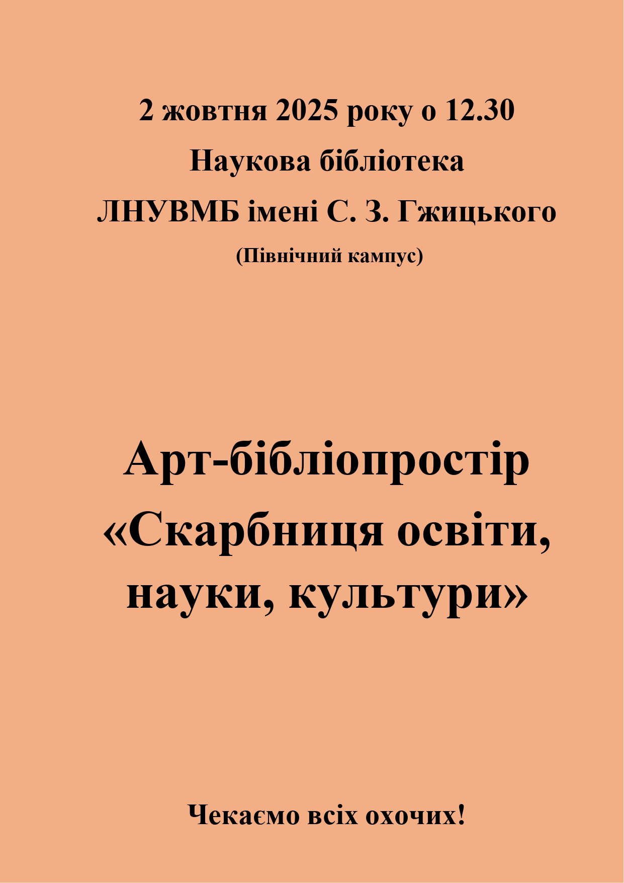 2 жовтня 2025 року у світлиці Наукової бібліотеки Львівського національного університету ветеринарної медицини та біотехнологій ім. С.З. Ґжицького (Північний кампус) було організовано комунікативно-мистецький захід «Скарбниця науки, освіти, культури» з нагоди відзначення Всеукраїнського дня бібліотек, Міжнародного дня музики, Дня працівників освіти та Всесвітнього дня архітектури. У цей день Наукова бібліотека стала соціокультурним простором, слугуючи платформою для цікавих ідей та проєктів.