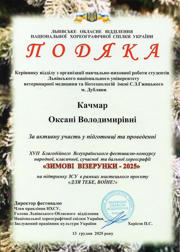 13 грудня 2025 року у Львівському національному університеті ветеринарної медицини та біотехнологій імені С.З. Ґжицького (Північний кампус) відбувся XVII Благодійний всеукраїнський фестиваль-конкурс народної, класичної, сучасної та бальної хореографії «Зимові візерунки – 2025», який проводився в рамках мистецького проєкту «Для тебе, воїне!» на підтримку ЗСУ. Фестиваль організовано Львівським обласним відділенням Національної хореографічної спілки України за підтримки Департаменту з питань культури, національностей та релігій, Департаменту освіти і науки Львівської обласної військової адміністрації та Львівського національного університету ветеринарної медицини та біотехнологій імені С.З. Ґжицького.