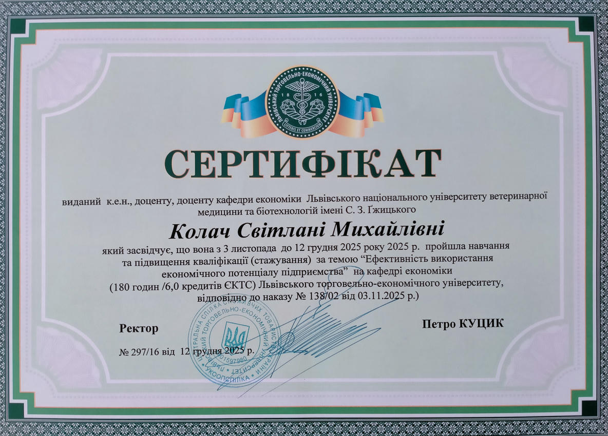 Викладачі кафедри економіки доц. Орися Василина, доц. Світлана Колач та доц. Руслана Магійович успішно завершили стажування на кафедрі економіки Львівського торговельно-економічного університету, яке проходило з 3 листопада по 12 грудня 2025 року.