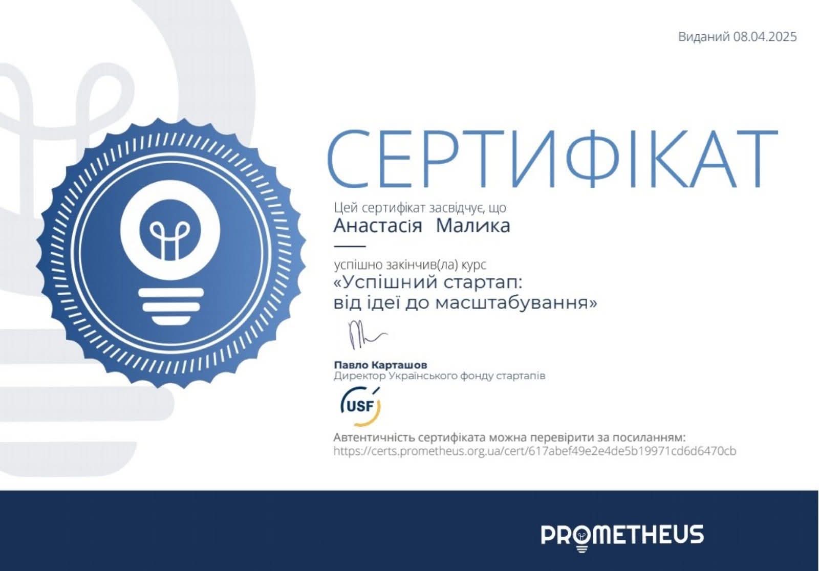 Здобувачі першого (бакалаврського) рівня вищої освіти спеціальності 051 Економіка в рамках вивчення дисципліни «Економіка бізнесу», а також спеціальностей 122 Комп’ютерні науки і 126 Інформаційні системи і технології в рамках вивчення дисципліни «Ведення бізнесу в ІТ (стартапи)» (ведучий викладач – к.е.н., доцент Ганна Сиротюк) успішно завершили онлайн-курс «Успішний стартап: від ідеї до масштабування», здобувши практичні знання щодо створення, розвитку та масштабування власних бізнес-проєктів.