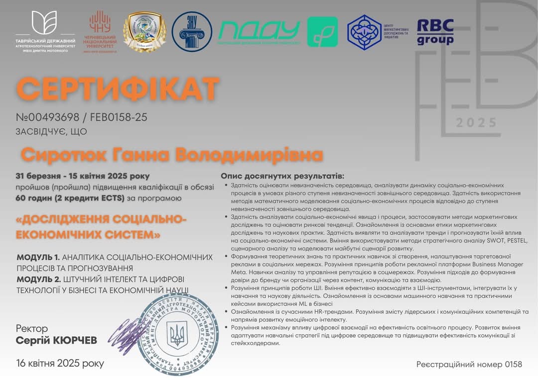 30 вересня – 9 жовтня 2025 року к.е.н., доцент кафедри економіки Зіновій Березівський успішно пройшов міжнародне підвищення кваліфікації науково-педагогічних працівників ЗВО на тему «Academic Integrity in Masters Degree Training in European Union Countries and Ukraine» («Академічна доброчесність при підготовці магістрів в країнах Європейського Союзу та Україні») обсягом 1,5 кредиту ECTS (45 годин), організоване Інститутом справ публічної адміністрації ISAP (м. Люблін, Республіка Польща) та ГО «Міжнародна фундація науковців та освітян» (Україна).