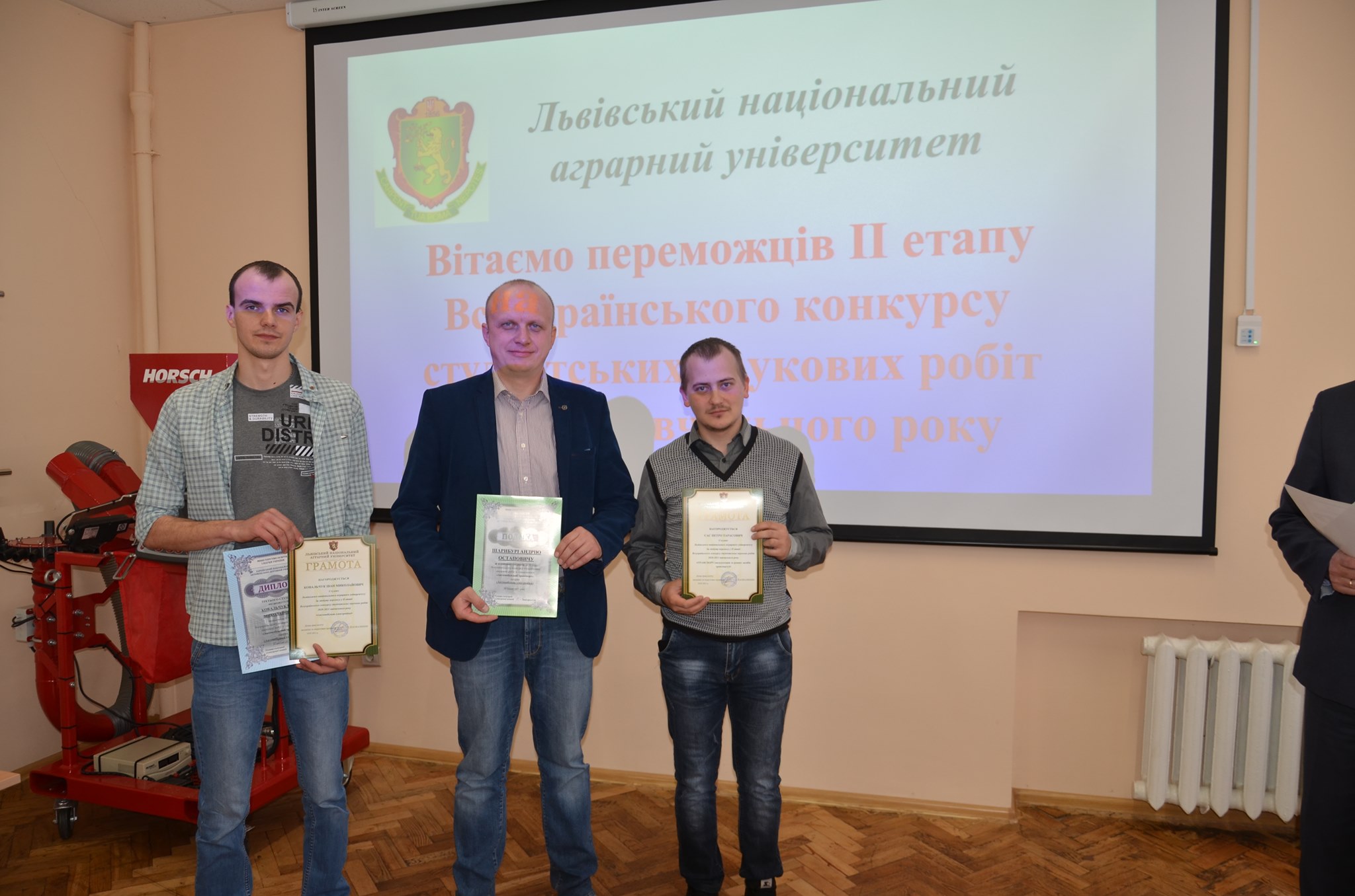 2019-2020 н. р. – Городецький І.І., Павлат П.Ю., призер Міжнародного конкурсу студентських наукових робіт із спеціальності 208 - Агроінженерія, Миколаївський національний аграрний університет, диплом ІІІ ступеня (науковий керівник: к.т.н., доцент В.В. Буртак, к.т.н., доцент Р.В.Гуменюк );