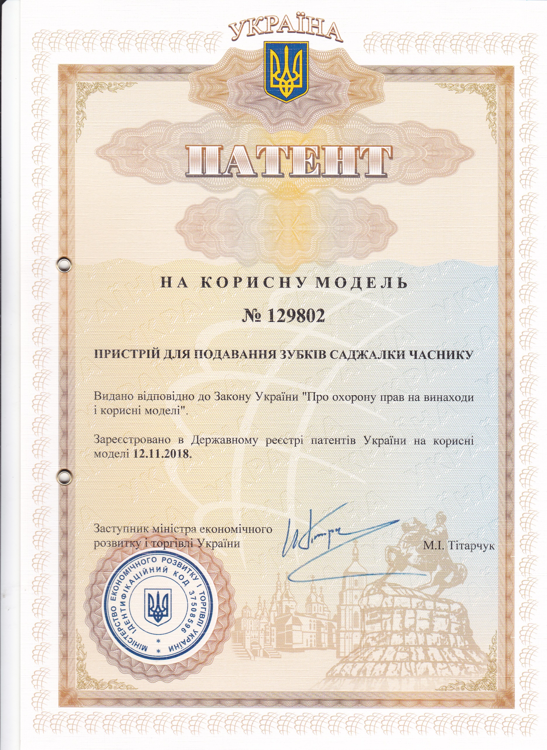 1. Засіб для механізованого поштучного садіння зубків часнику:Україна: МПК А01С 7/16. № и 202301205; заявл. 18.03.2023. (автори: Семен Я.В., Крупич О.М., Семен О.Я., Крупич С.О., Петриця В.Т., Думич В.В.);