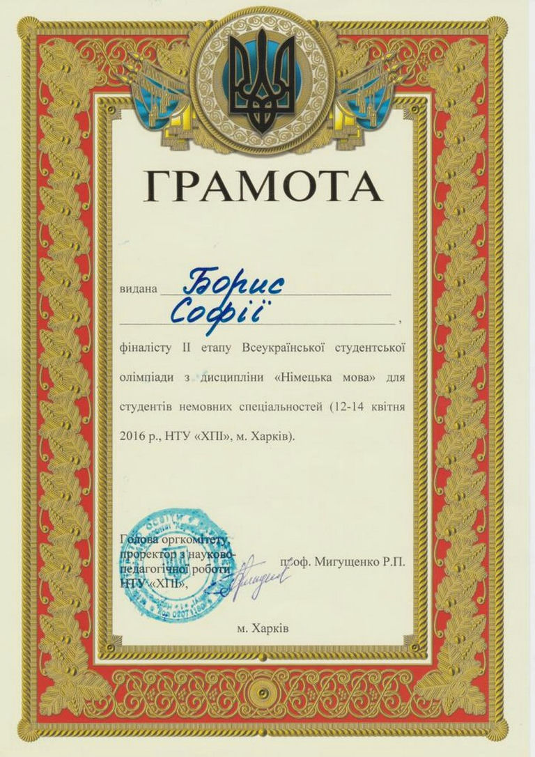 За результатами олімпіади з німецької мови: 1 місце посів: Борис Софія , ст.гр Оа-12сп ; 2 місце - Зінько Роман ,ст.гр. Еко-25 ; 3 місце - Терех Катерина ,ст.гр. Мо-22.