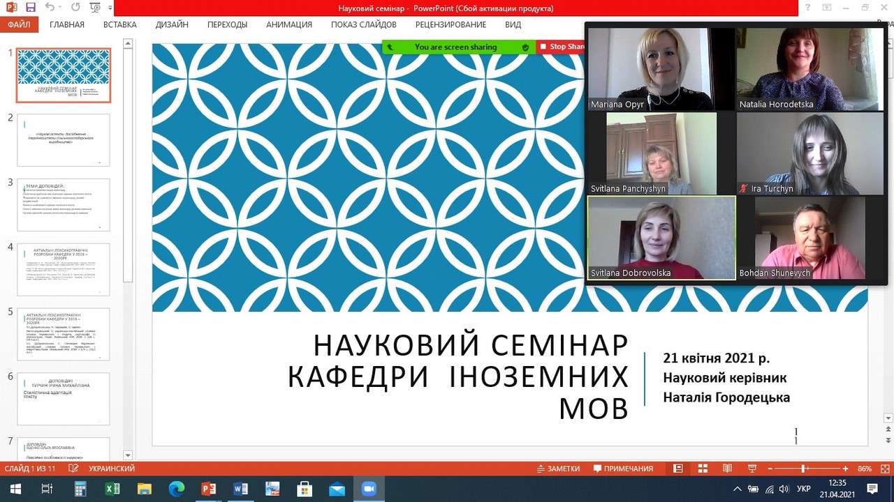 14 квітня 2021 р. відбулося у відеорежимі третє засідання семінару кафедри іноземних мов ЛНАУ на тему «Методика комбінованого навчання іноземних мов студентів закладів вищої освіти в Україні».