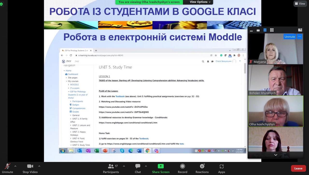 Засідання організував і провів професор Богдан Шуневич. Він проаналізував сучасний стан денного та дистанційного навчання іноземних мов у нашому університеті в умовах епідемії коронавірусу та воєнного стану і окреслив перспективи на майбутнє, доц. О. Іващишин зупинилася детальніше на використанні ВНС Moodle, вебдодатка TALAS та освітніх платформ Zoom, МТ в ЛНУ імені І. Франка, доц. Н. Партико описала стан використання нових технологій під час дистанційного викладання англійської мови українським студентам та поділилася досвідом читання онлайн-лекцій з психології китайським студентам, які навчаються у НУ «ЛП», а доц. Л. Гутор описала проблеми і шляхи їх подолання під час організації комунікації між викладачами і студентами на заняттях з англійської мови в ЛНМУ.