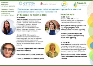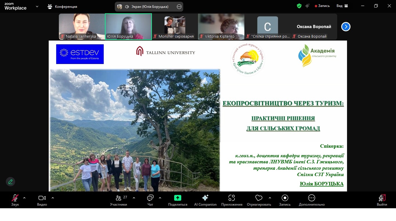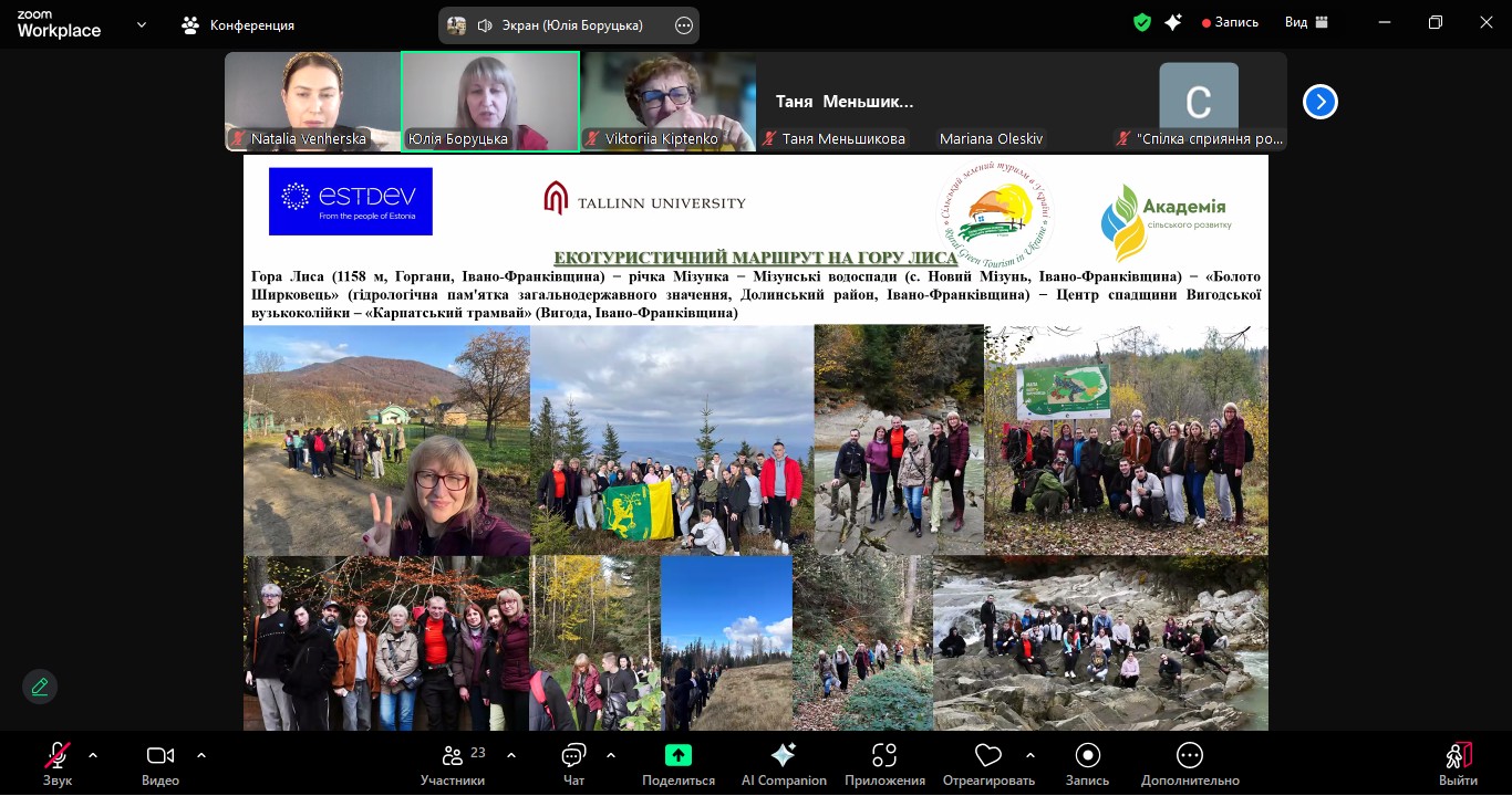 Доповідь доцентки кафедри Юлії Боруцької на тему: "Екопросвітництво через туризм: практичні рішення для сільських громад" в естонсько-українській навчальній програмі «Партнерство для створення спільних локальних продуктів та кластери для підвищення їх експортної спроможності»