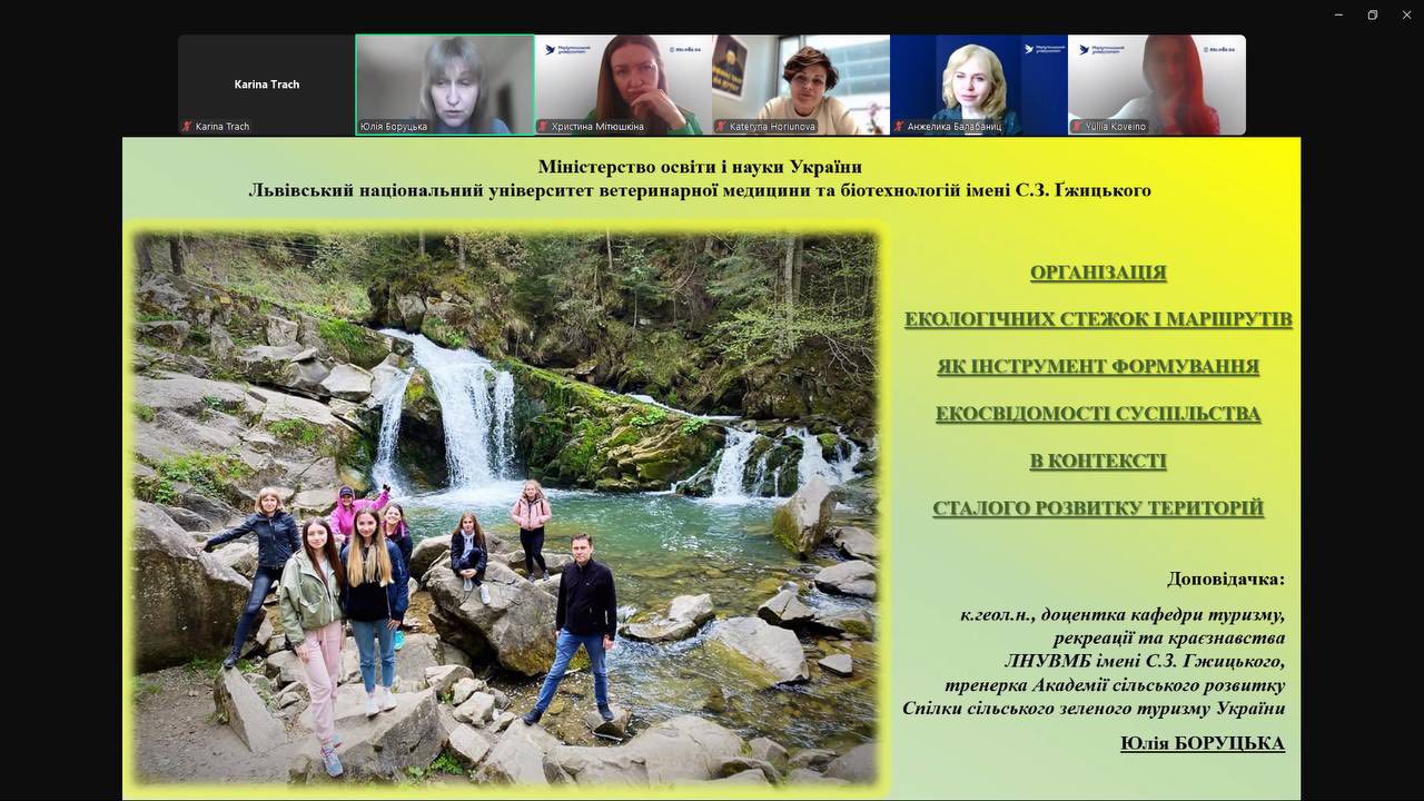Виступ доцентки кафедри туризму, рекреації та краєзнавства Юлії Боруцької з доповіддю на тему: "Організація екологічних стежок і маршрутів як інструмент формування екосвідомості суспільства в контексті сталого розвитку територій" на Круглому столі "Туризм і екологічні виклики", організованому Кафедрою маркетингу та туризму Маріупольського державного університету в рамках міжнародного проєкту «Жива лабораторія кліматичної справедливості» (CJLL) за фінансової підтримки Європейської комісії в рамках програми Erasmus+.