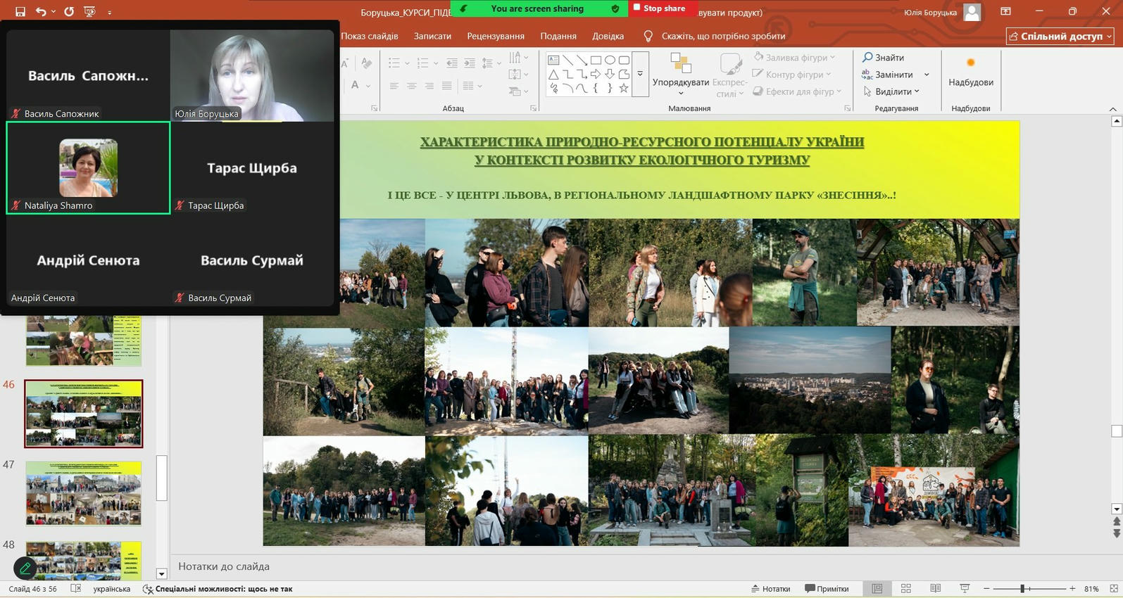 Програмою підвищення кваліфікації було передбачено 8 тем, які стосуються туризму та рекреації. Слухачі мали можливість заслухати лекції-діалоги, які супроводжувалися насиченими презентаціями та прикладами і взяти участь в практичних заняттях, де спільно розв’язували цікаві завдання. Обов’язково в рамках самостійної роботи кожному надавались додаткові завдання. Загалом дане підвищення кваліфікації було цікавим для обох сторін, була можливість поділитися досвідом, обговорити проблеми сьогодення у туристично-рекреаційній сфері.