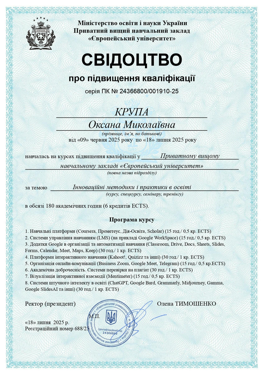 Навчання науково-педагогічних працівників кафедри туризму, рекреації та краєзнавства Оксани Крупи і Юлії Боруцької на курсах підвищення кваліфікації за темою: "Інноваційні методики і практики в освіті", організованих Приватним вищим навчальним закладом «Європейський університет».