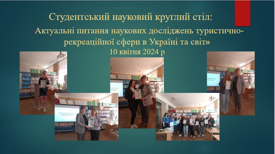 «Актуальні питання наукових досліджень туристично-рекреаційної сфери в Україні та світі», 10 квітня 2024 р.;