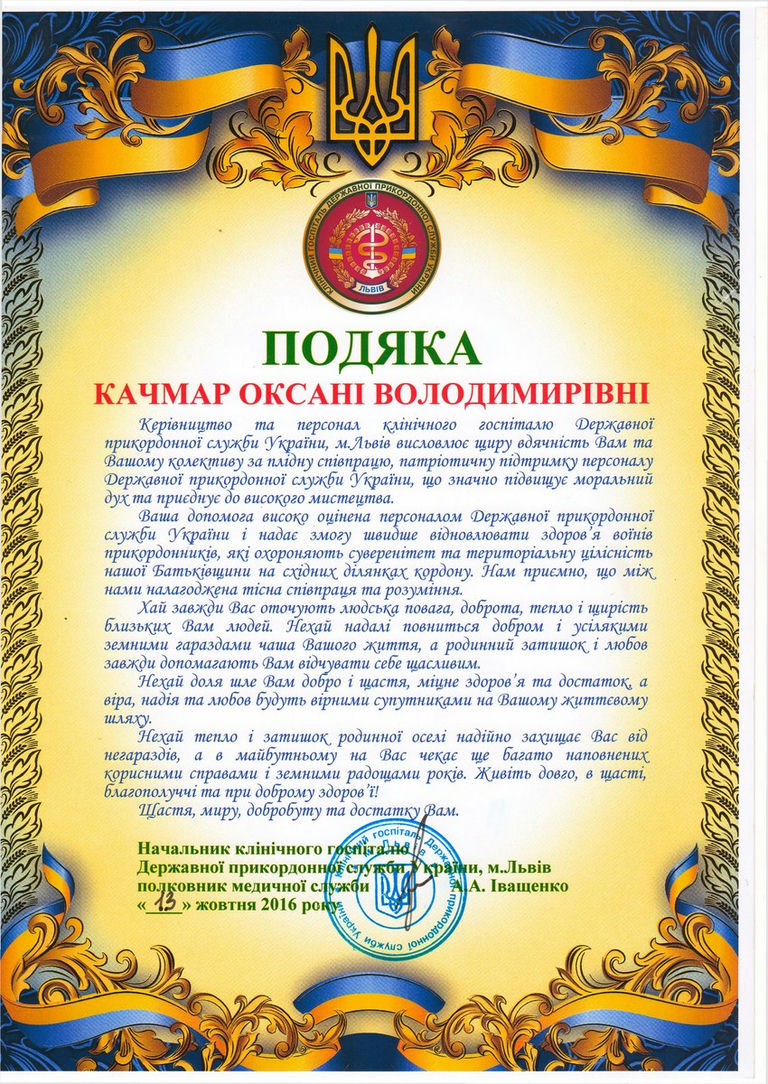 Колективи Львівського НАУ та керівники Побєда Харісов, Вікторія Юрків, Степан Вус, Марія Мандзак, Марія Дребот отримали Подяки від начальника клінічного госпіталю державної прикордонної служби, полковника медичної служби А.А. Іващенка, у яких від імені керівництва та персоналу госпіталю було висловлено щиру вдячність за патріотичну підтримку та плідну співпрацю із Державною прикордонною службою України.