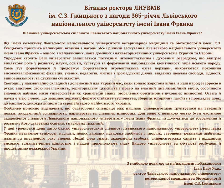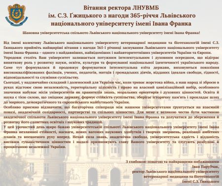 Від імені колективу Львівського національного університету ветеринарної медицини та біотехнологій імені С.З. Ґжицького висловлюю щиру вдячність кожному захиснику нашої країни. Ваш подвиг назавжди житиме в наших серцях. Ваша відвага, мужність і самопожертва залишаться у пам’яті народу навіки.