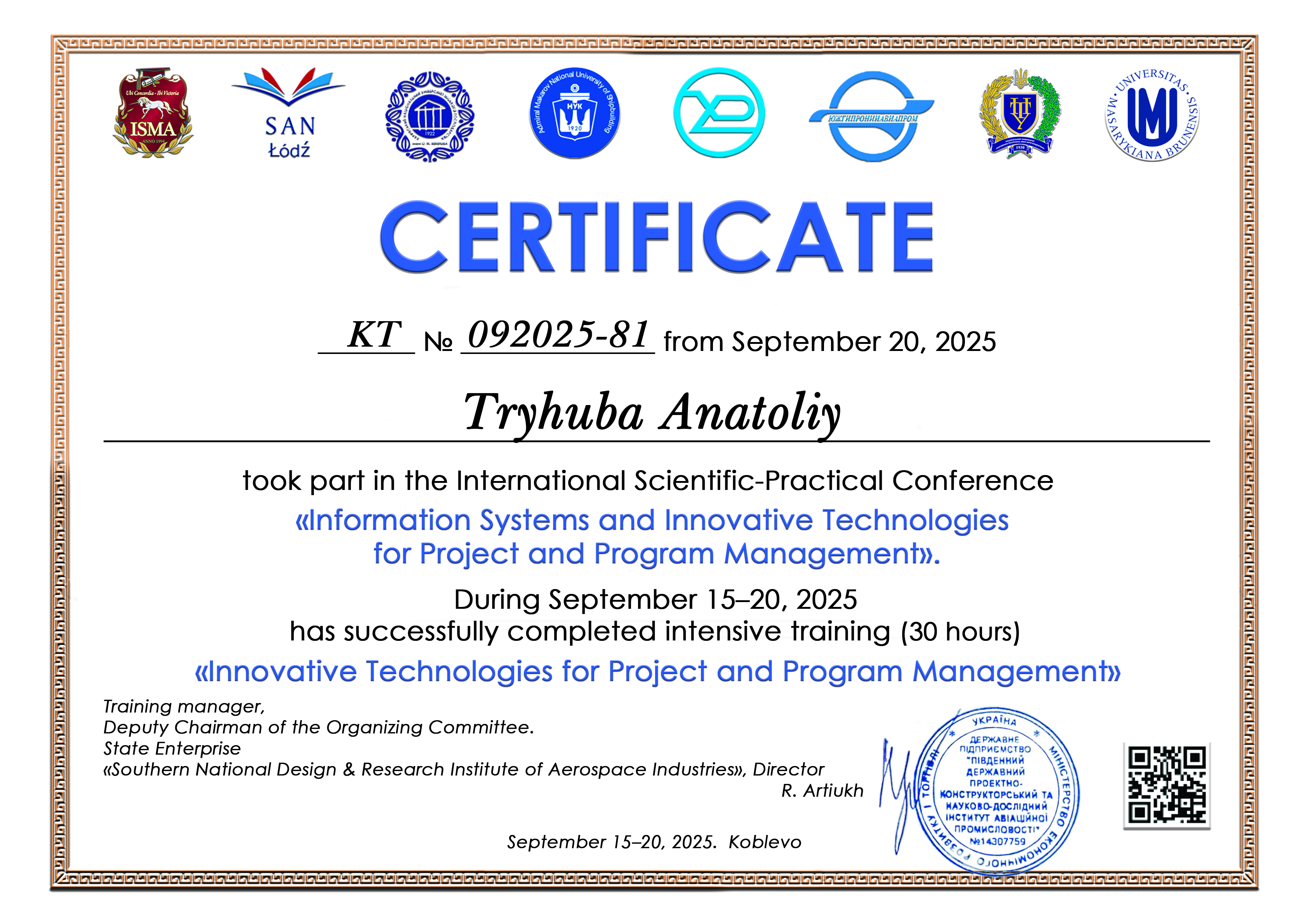 Під час заходу професор А.М. Тригуба успішно пройшов інтенсивне навчання (30 годин) за програмою «Innovative Technologies for Project and Program Management», у межах якої розглядалися питання цифрової трансформації управління проєктами, застосування кіберфізичних систем, штучного інтелекту та Інтернету речей у практиці проєктного менеджменту.