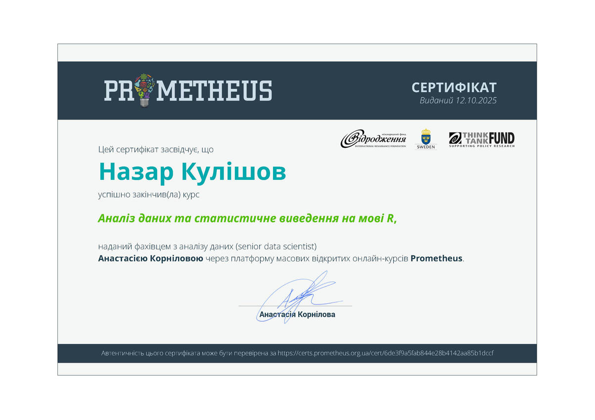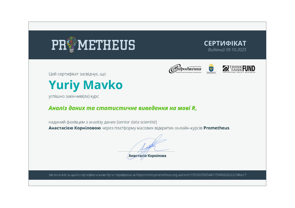 Кожного навчального року кафедра ІТ активно заохочує здобувачів вищої освіти поєднувати формальну та неформальну освіту, брати участь у тематичних курсах від ІТ-компаній, спеціалізованих курсах від Prometheus тощо. Так, в рамках проходження вибіркового курсу «Інтелектуальний аналіз даних» студенти групи Іт-41 Юрій Мавко та Назар Кулішов пройшли навчання на платформі Prometheus та отримали відповідні сертифікати, що підтверджують компетенції, здобуті в неформальній освіті.