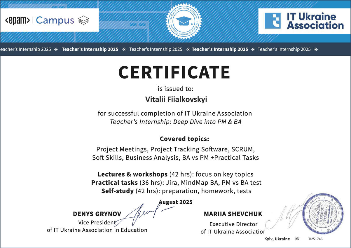 Старший викладач кафедри ІТ В.І. Фіялковський у серпні 2025 року пройшов навчальну програму від компанії EPAM, основною метою якої було поглиблення зв’язку викладачів з ІТ-індустрією для кращого розуміння сьогоднішніх реалій ІТ-сфери та передачі студентам максимально прикладних і актуальних знань і навичок для успішної кар’єри в майбутньому.