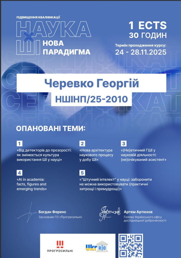Викладачі кафедри економіки ЛНУВМБ імені С.З. Ґжицького успішно пройшли онлайн-курс підвищення кваліфікації «Наука ШІ: нова парадигма», що відбувся 24-28 листопада 2025 року та був організований ГО «Прогресильні» у співпраці з Українським офісом дослідницької доброчесності.