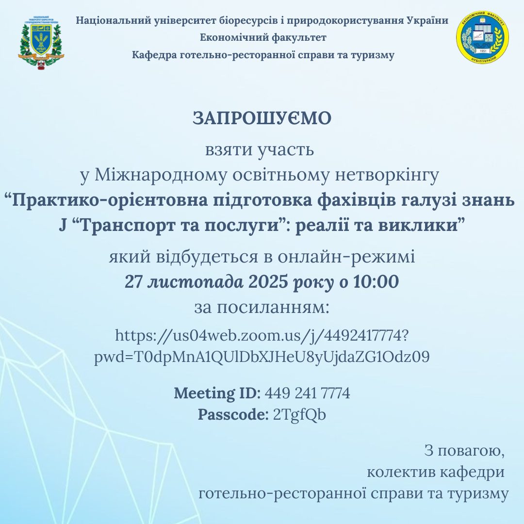 Участь науково-педагогічних працівників кафедри туризму, рекреації та краєзнавства ЛНУВМБ імені С. З. Ґжицького, завідувачки Оксани Крупи і доцентки Юлії Боруцької, у Міжнародному освітньому нетворкінгу «Практико-орієнтована підготовка фахівців галузі знань J «Транспорт та послуги»: реалії та виклики».