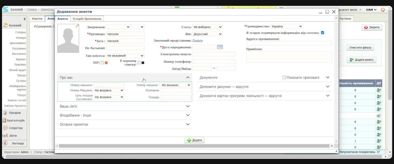 • організацію процесів бронювання, поселення та виїзду гостей;