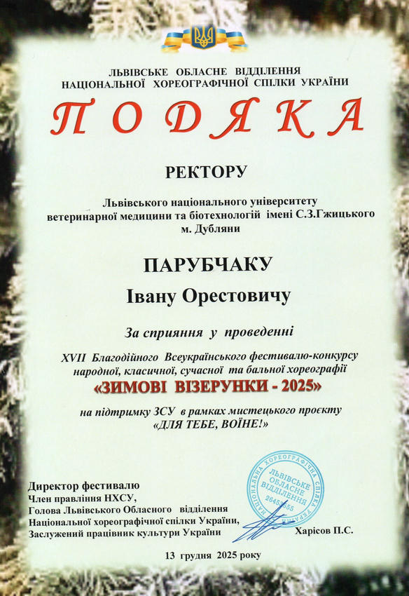 13 грудня 2025 року у Львівському національному університеті ветеринарної медицини та біотехнологій імені С.З. Ґжицького (Північний кампус) відбувся XVII Благодійний всеукраїнський фестиваль-конкурс народної, класичної, сучасної та бальної хореографії «Зимові візерунки – 2025», який проводився в рамках мистецького проєкту «Для тебе, воїне!» на підтримку ЗСУ. Фестиваль організовано Львівським обласним відділенням Національної хореографічної спілки України за підтримки Департаменту з питань культури, національностей та релігій, Департаменту освіти і науки Львівської обласної військової адміністрації та Львівського національного університету ветеринарної медицини та біотехнологій імені С.З. Ґжицького.